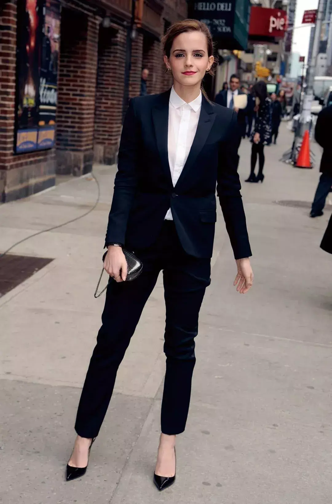 用烟管裤来搭配外套,一定是精干利落的感觉,本身裤型修饰腿型好看的线条就极显腿长轻盈,穿上套装更显利落,像这样一身黑色更显瘦利索,是职场精英一枚。