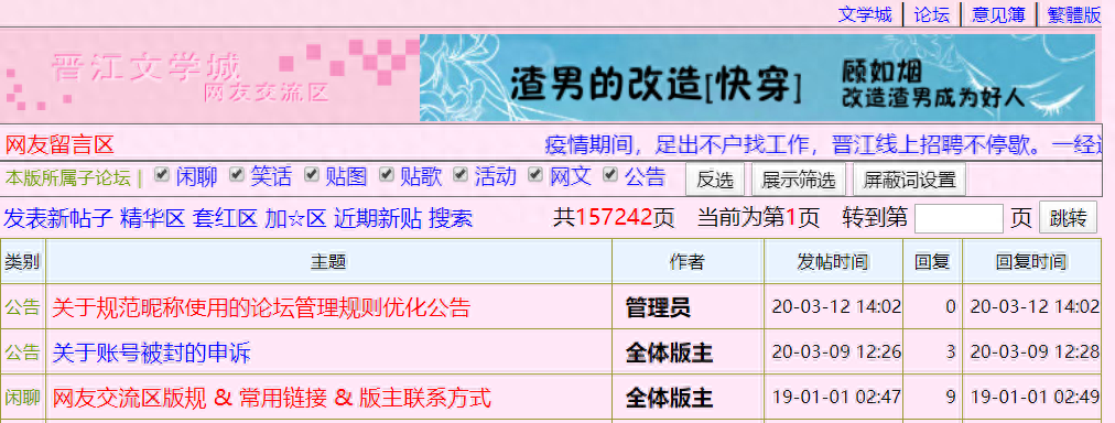 兔区是老牌八卦论坛了,因此江湖送它的称呼比较多:因版面粉红色,称“小粉红”;因匿名发帖(现在不能匿名了)时现实名字为“==”,又称“双眼皮区”;因为水军、粉丝大量涌入,被称为“垃圾场”。总之称呼最多的还是“兔区”。兔区版规不能外放链条,所以开放程度比较低。不过小生可以给大家指路:晋江文学城—网友交流区—网友留言区。