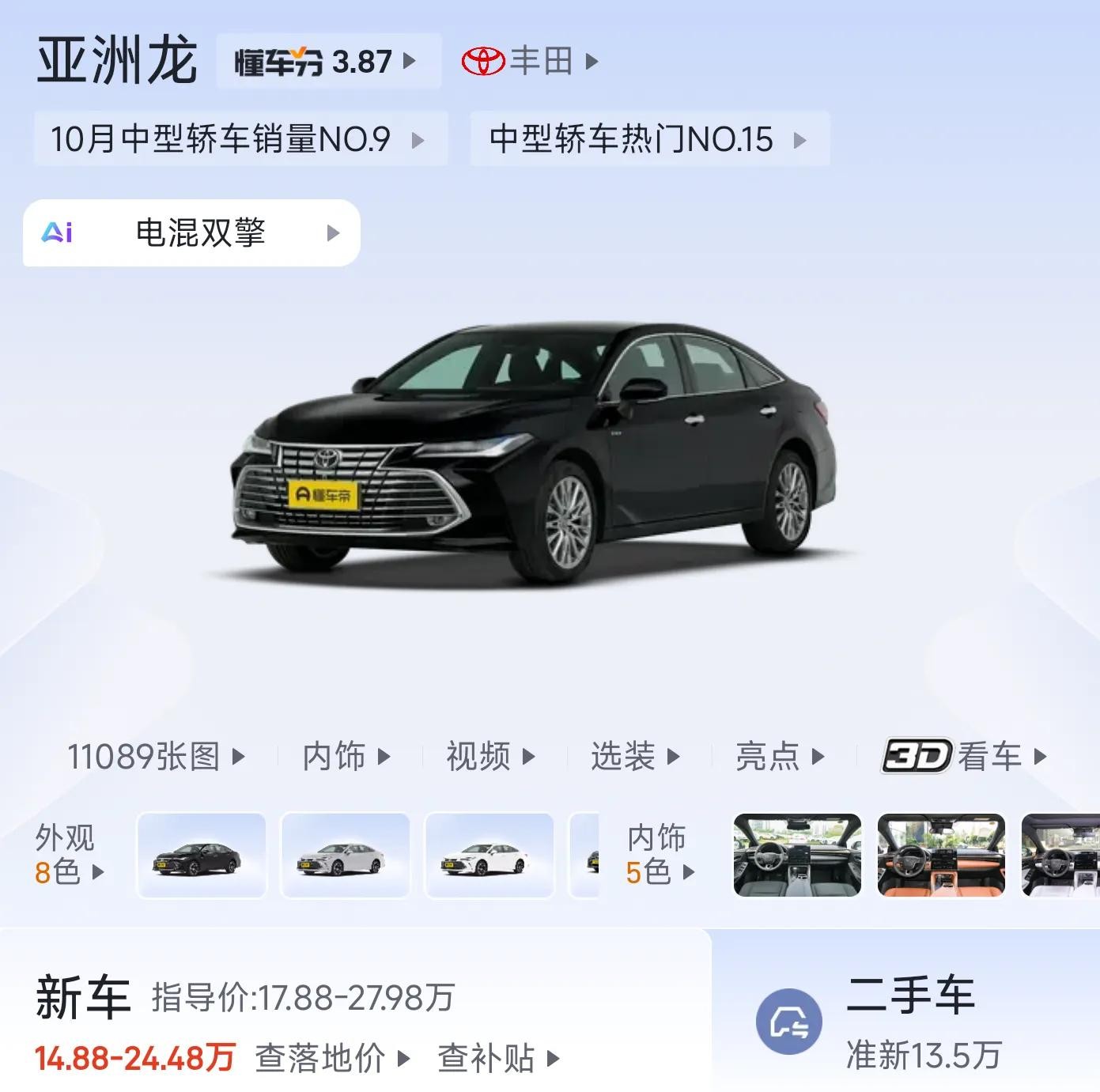 亚洲龙:指导价17.88-27.98万,终端优惠幅度较大,部分地区优惠可达4-5万左右,定位略高于凯美瑞,配置更丰富,适合对豪华感和舒适性有要求的消费者,但现在价格十分优惠!