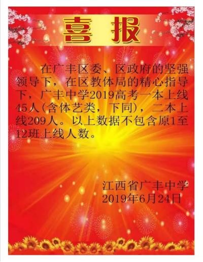 2019年广丰中学高考喜报:一本上线45人,二本上线209人。