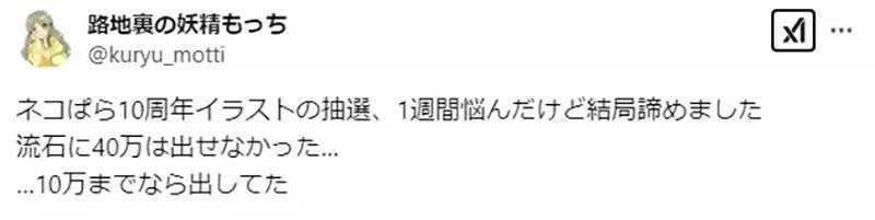 「《猫娘乐园》10周年画作的抽签,我烦恼了一个星期还是决定放弃了。40万日元实在太贵了……10万的话还可以接受。」
