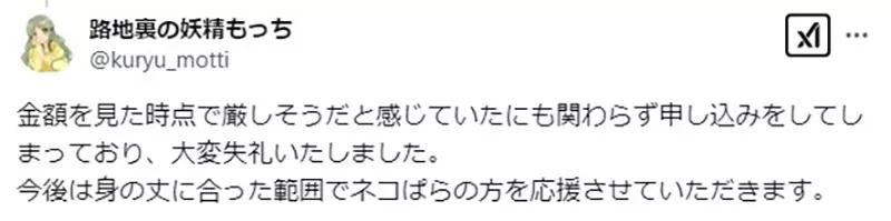 「我当初看到金额的时候,虽然觉得不太能够承受,却还是申请抽签,真的很抱歉。以后我会谨守量力而为的分寸,继续支持《猫娘乐园》。」