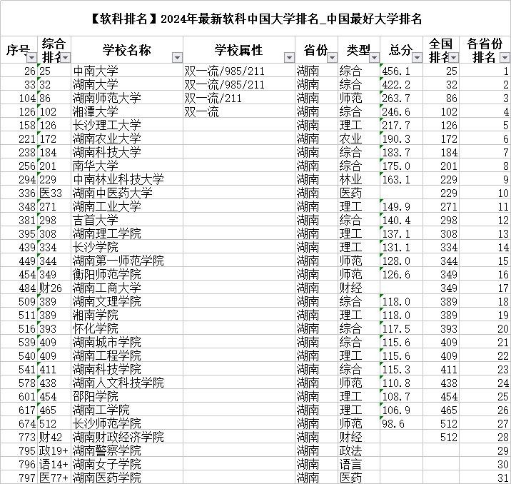 湖南高校2024全国排名,湖南大学25名,中南大学32名