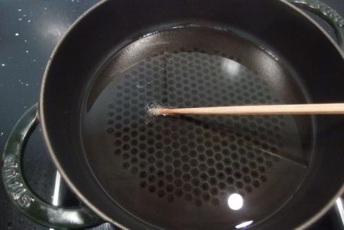 油面有细微波动但总体依然比较平静,插入筷子后冒出少量微小气泡。
