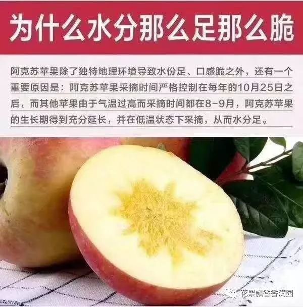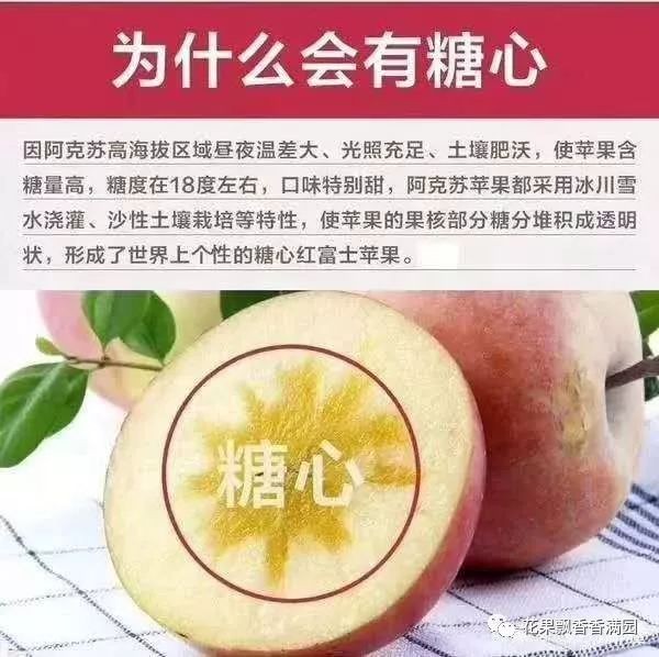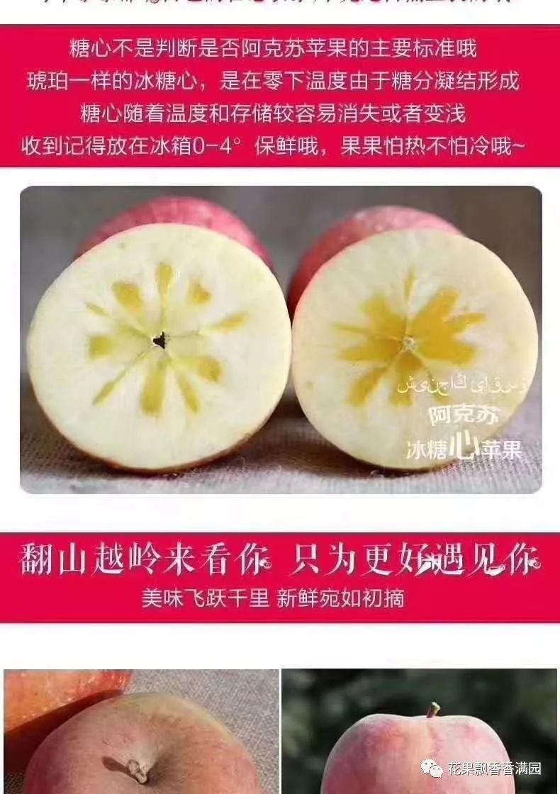 阿克苏冰糖心苹果产于新疆阿克苏市,位于天山托木尔峰南麓,为扁平形果,均重250克,果面光滑细腻、色泽光亮自然,皮薄肉厚、质地较密、味甜汁多、含糖量高。阿克苏冬季寒冷,果品生长期病虫害少,昼夜温差大、光照充足,无污染的冰川雪融河水浇灌、富硒沙性土壤栽培、高海拔的生长环境,使阿克苏苹果的果核部分糖分堆积成透明状,形成了世界上独一无二的“冰糖心”。光果采摘时间严格控制在每年的10月25日之后,较长的生长期让阿克苏苹果更多的汲取了大自然的天地精华,形成了无与伦比的独特品质,被称为新疆的“水果皇后”,更以其独特的“冰糖心”而饮誉海外。