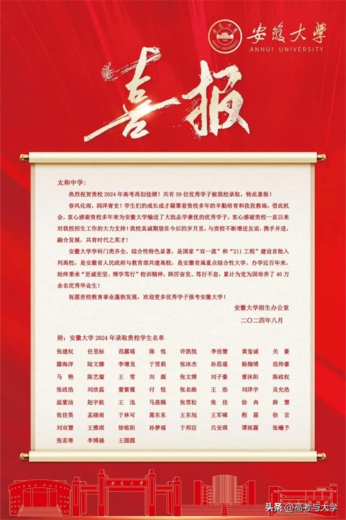 太和一中2024年高考985录取92人,其中清北3人,C9院校22人,211院校309人,双一流院校340人,军警院校33人。