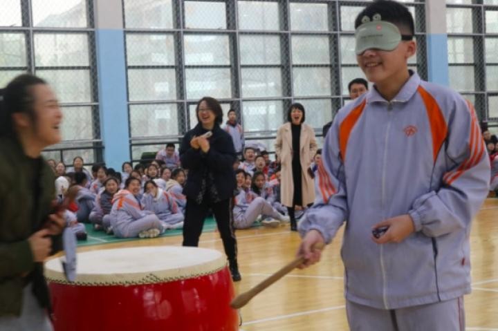 名扬花鼓也在班级之间进行比拼,每班一人蒙眼行走五米敲鼓,敲中即可获得奖励。