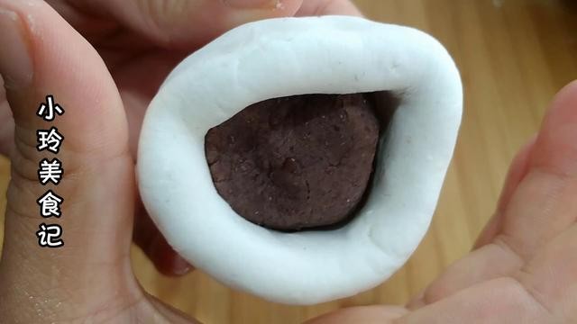 步骤二:面醒发好了,再揉一揉,取一小块面用手按成小碗的形状,放入豆沙馅收口再揉圆,轻轻的按扁,油炸糕生坯全部做好了