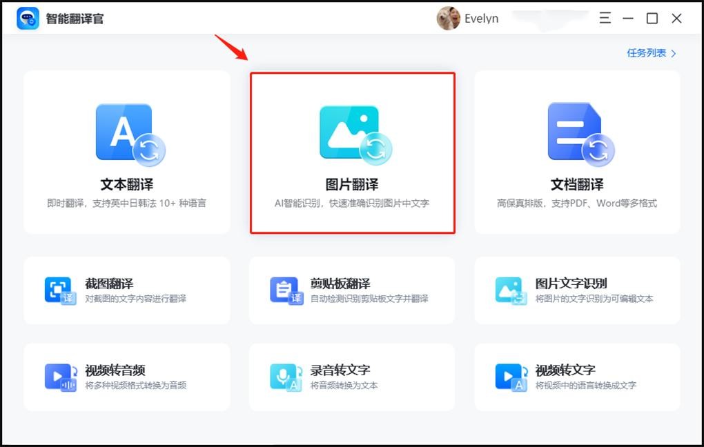 第一步:首先我们直接打开我们的软件工具,进入到首页,在进入直接,我们直接去点击【图片翻译】进入到界面中。