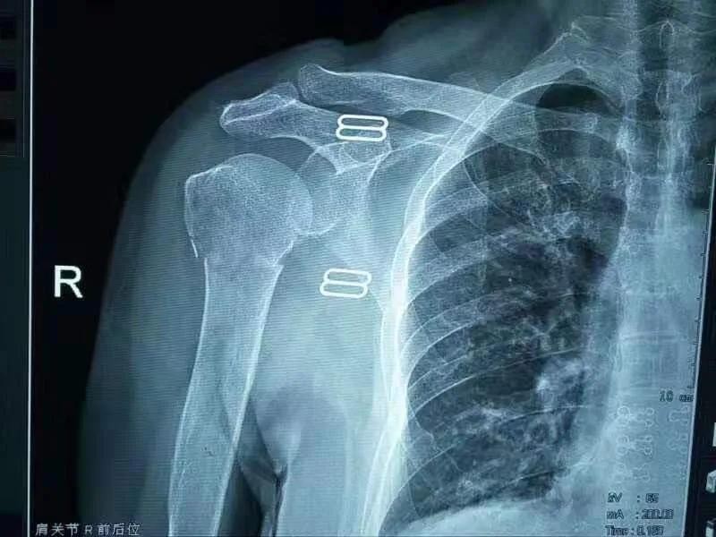 在X线片上可以看到肩关节、肱骨、肘关节、锁骨、肱骨大小结节、肱骨解剖颈、肱骨外科颈。