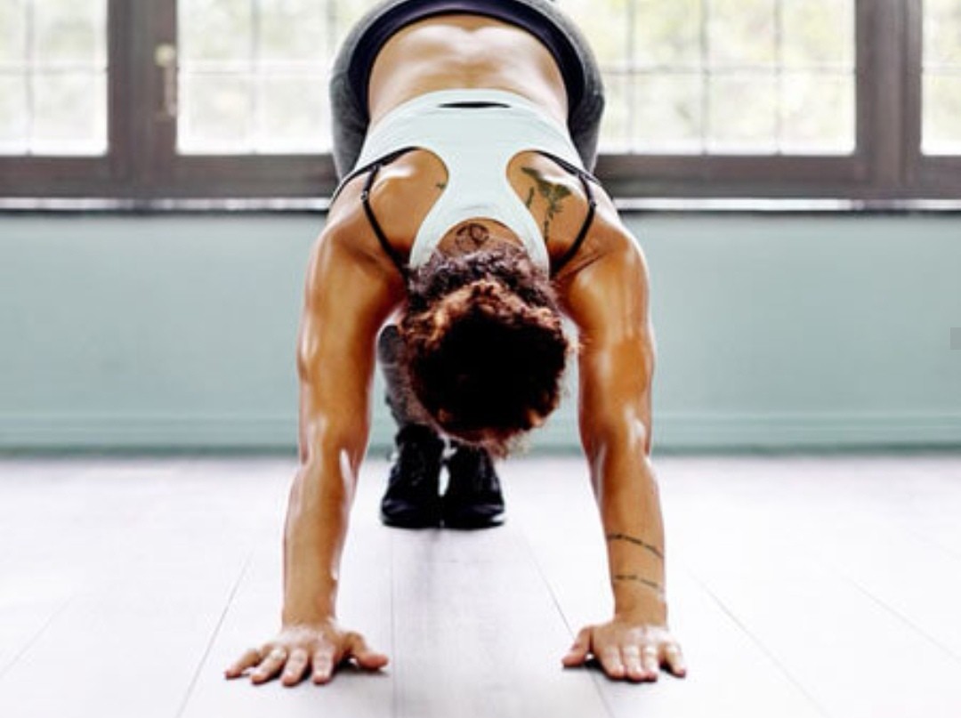 做出伏地挺身的准备动作,然后轮流弯曲双脚,直到膝盖碰到手肘,动作要像在跑步一样快,可以训练到全身肌肉。