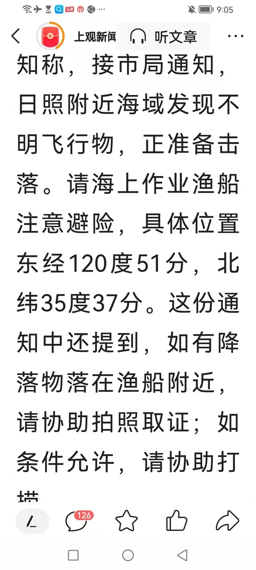 昨天下午,山东日照、即墨上空发现不明飞行物,网传山东青岛即墨区海洋发展局发消息通知称,日照附近海域发现不明飞行物,正准备击落,要求海上渔船注意避险,如有降落物在你渔船附近,请协助拍照取证;如果条件允许,请协助打捞。