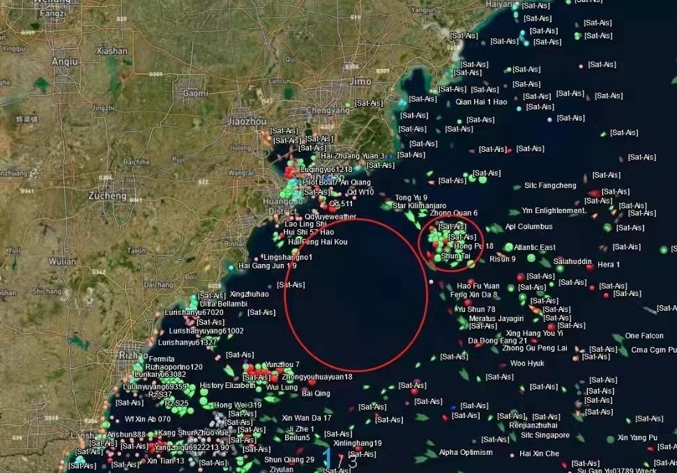 这是2023.2.13日早上7点查询山东海域船只情况,看样还没有打下来,大家都围在东京120度51分,北纬35度37分,等着快速出击,准备取证,顺便打捞上来。