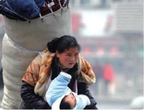 图片中的母亲为了生活背着有她两倍体积的行李负重前行。而被妈妈抱在怀里的孩子却睡得无比香甜。这赖于母亲臂弯的温暖,也赖于母亲前行的稳妥。只要孩子能过得好,即便再累也值得。