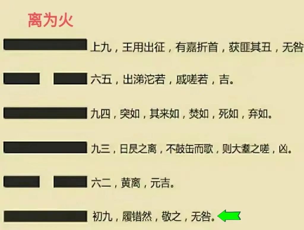 我们仔细观察卦象,初九爻处于离为火的最底层,类似于蹒跚学步的幼童,父母亲要不断地鼓励他,有利于及时纠偏。也就是说,小孩子对光明的需求非常单纯,得到父母亲的鼓励即可。