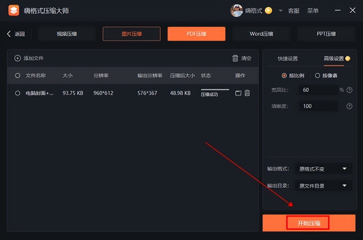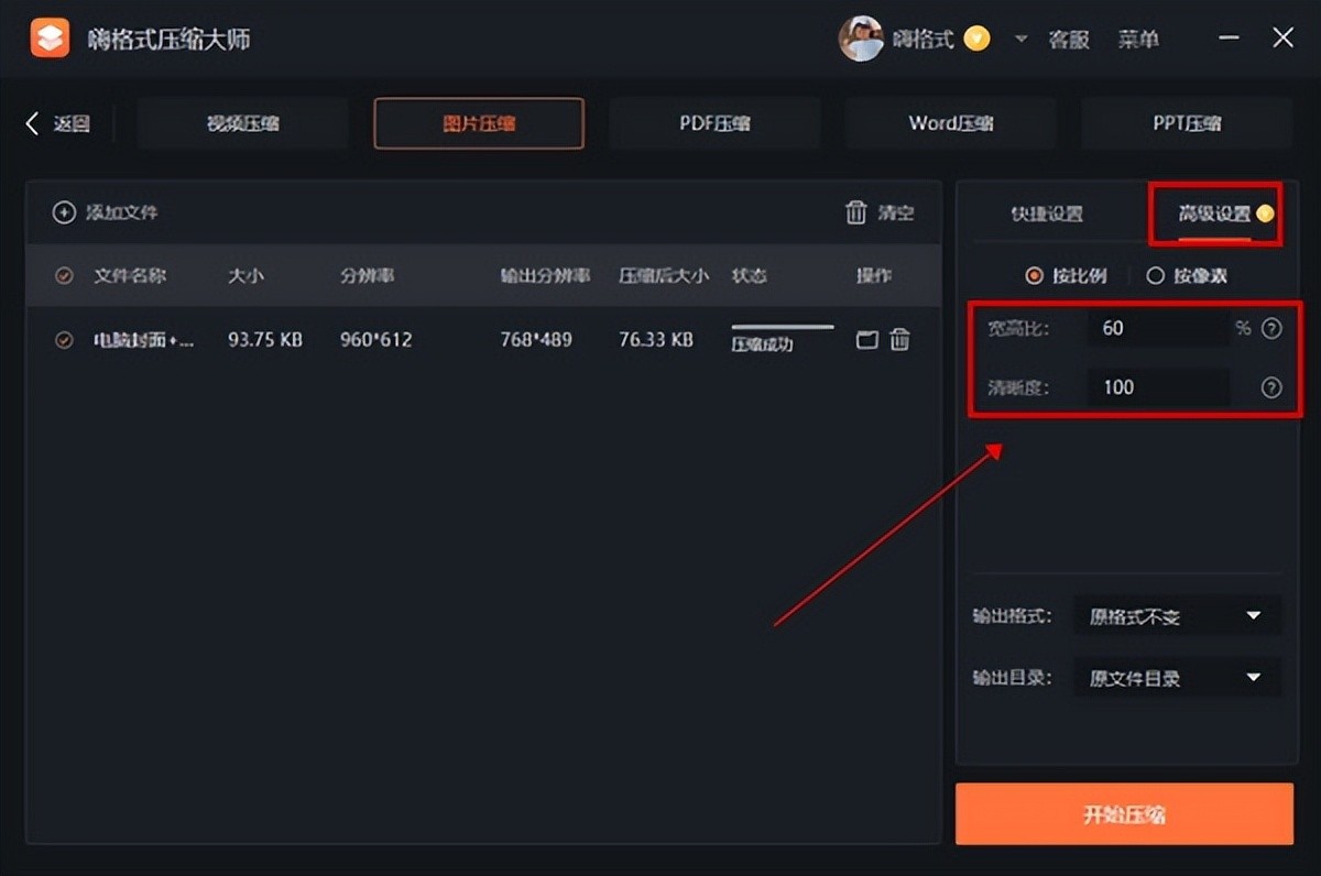 3、设置好后点击“开始压缩”按钮后就可以成功将照片压缩了,在软件中可以直接看到压缩后的照片大小。