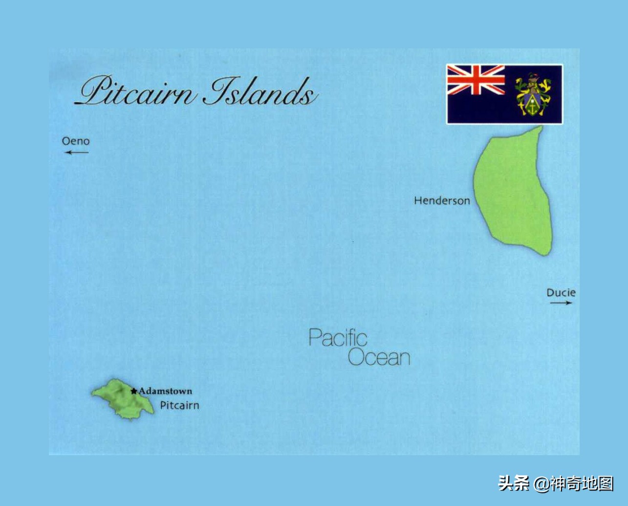 皮特凯恩群岛(Pitcairn Islands)是英国最为偏远的海外领地,由皮特凯恩、亨德森(Henderson)、迪西(Ducie)和奥埃诺(Oeno)等四个岛屿组成,其中只有皮特凯恩岛有人居住。群岛总面积47平方公里,人口55人,也就是个小村子。