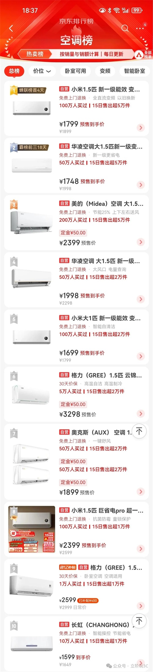 虽然离6月18日还有20天,但是618活动、618的价格在5月15日已经开始了,可以说618活动已经举行了半个月了。我看了一下京东空调热卖榜,吓我一大跳。