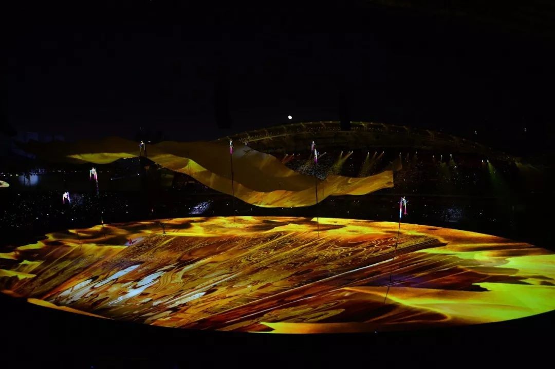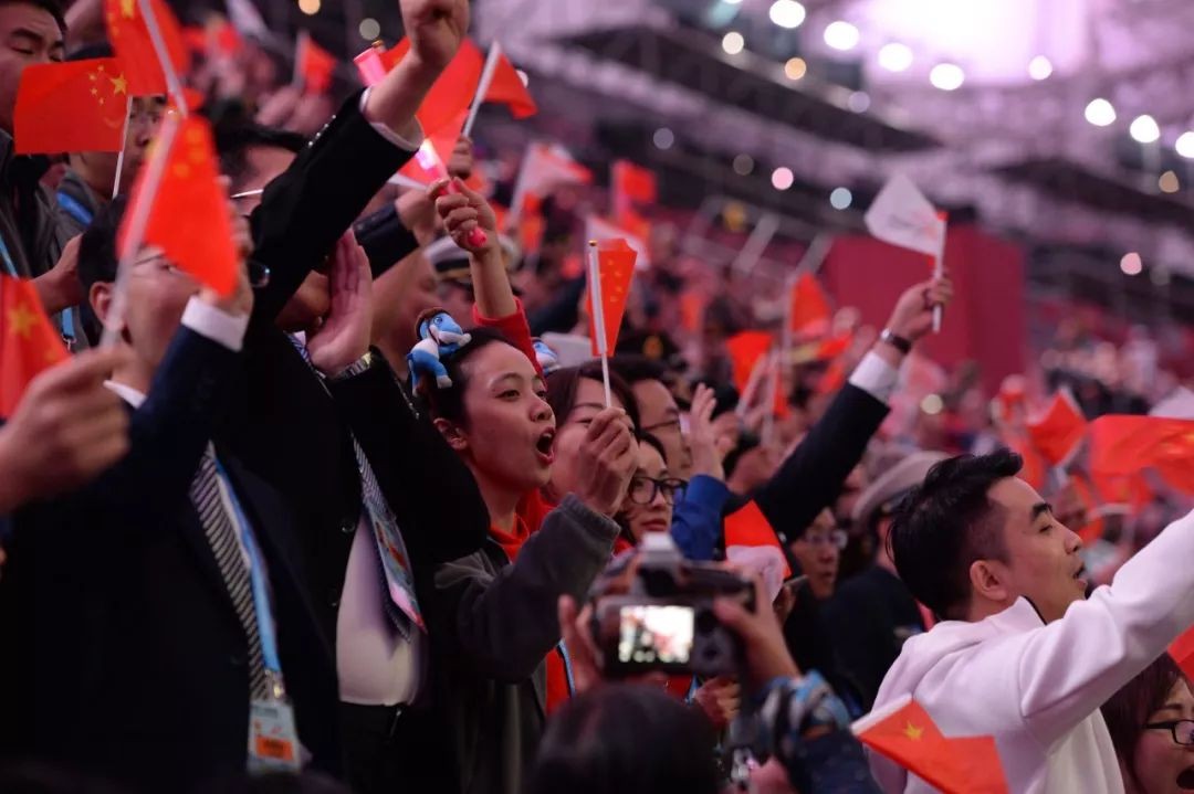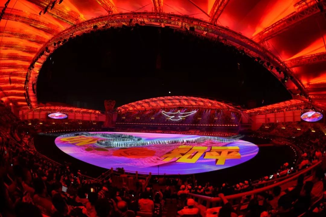 在观众欢呼声中,中华人民共和国国旗入场,紧随其后的是军运会会旗,护送国旗和会旗的各有8位旗手