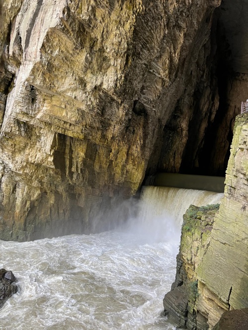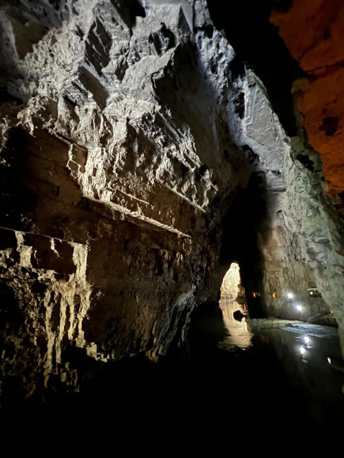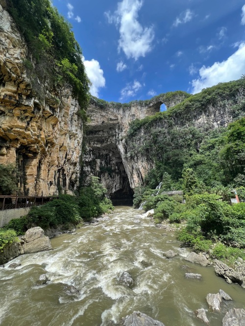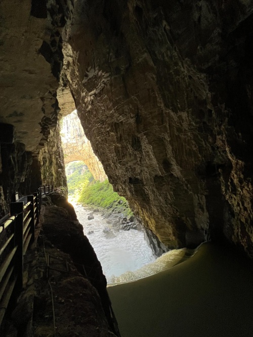 由于峡谷处于丰水期,暗河的水量增大,水流湍急,景区暂时关闭了洞内划船的项目。