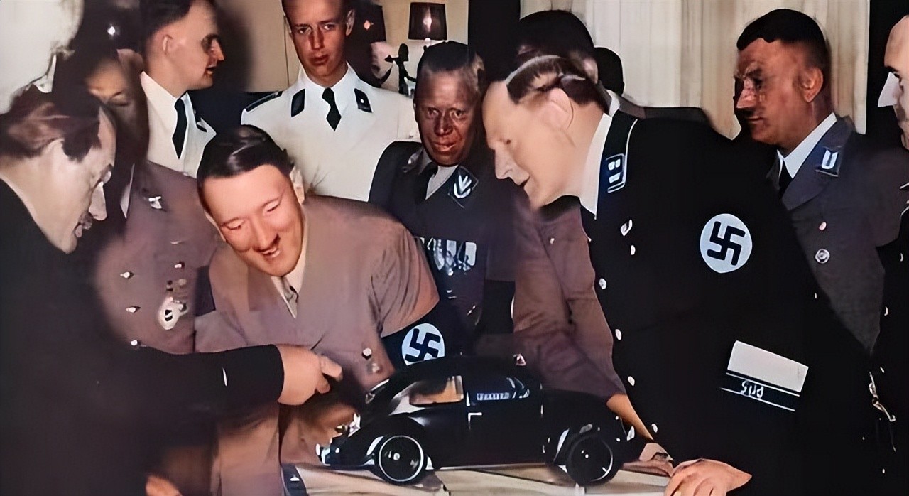 希特勒与德国政府高层们正在悉心研究一辆汽车模型,这辆汽车是保时捷公司最新研发的甲壳虫车型。