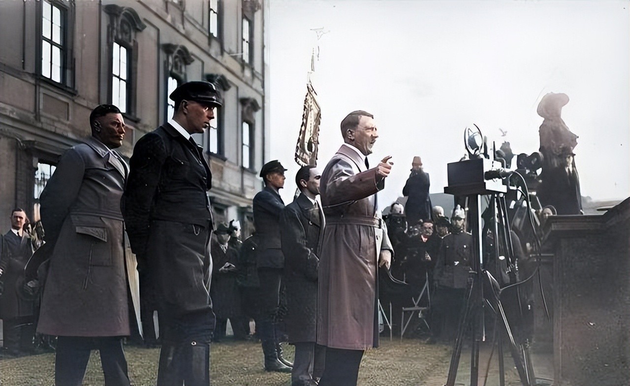 希特勒在德国民众面前进行演讲,将纳粹思想灌输给人们,他的身后是戈林,左边是戈培尔,这两个人都是他的得力助手,协助他实现纳粹目标。