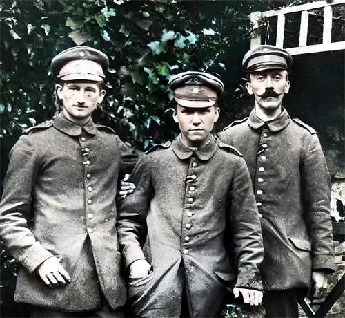 第一次世界大战期间,青年希特勒积极投身于国家的战争事业。照片中右边留着胡子的英勇青年,他就是希特勒,当时是德国巴伐利亚预备步兵团第16团的一名士兵。