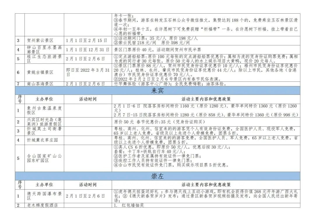此外,贺州、梧州、玉林、钦州、崇左等地区的景区也策划了特色活动并配以优惠礼包,邀约全区人民前往游玩。