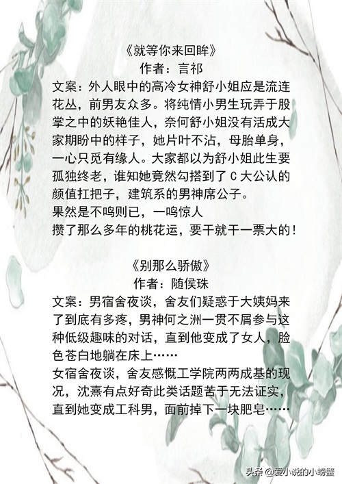 今天给大家推荐一些校园文啊,这两天高考又算是引发大家一些回忆吧,想念自己的校园时光吧,小说就是可以看到一些我们普通人没能经历的浪漫特别的校园,也许我们没谈过小说那种酸甜的青春恋爱,但我可以在小说中看到我喜欢的情节,剧情,这也是小说吸引我的地方吧!所以今天又给大家 推荐一些校园文呀,还有大学的。
