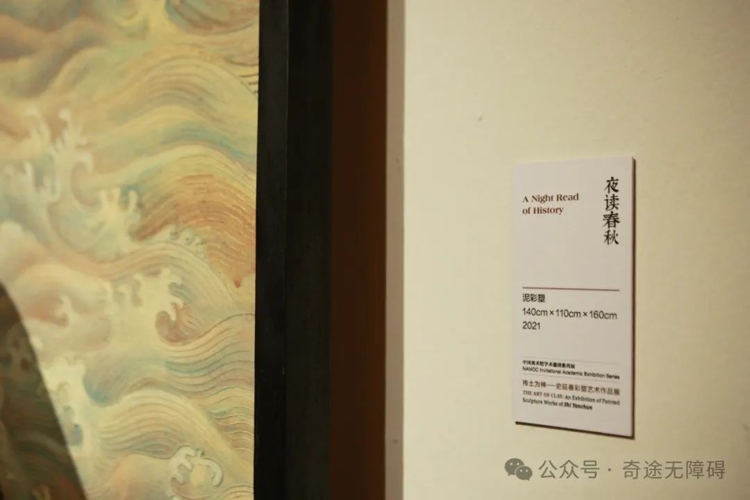 美术馆内展览的大多数为书画作品,展品和标签为贴墙垂直放置,前面有安全挡线。