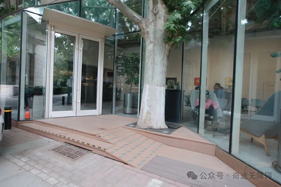 美术馆大门的旁边有无障碍坡道,坡道旁边有扶手,并且做了标识。
