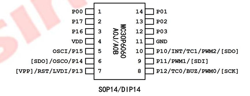 震动开关下面的SOP14封装的器件,根据丝印找到型号是MC30P6060,是一款高性能、低功耗8位OTP+IO型MCU。其内置RC振荡器、定时器和LVD等电路可广泛用于电动玩具、无线通信、LED照明等领域。