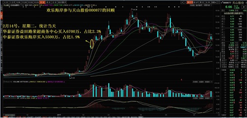 可以看出,在这些妖股的炒作中,欢乐海岸都不是决定性的力量,资金量不是很大;多是跟随者大佬在买入,可以跟着吃肉喝酒。这是第一个阶段,欢乐海岸的操作手法:跟着游资大佬同时买入;或者在游资大佬买入,第二天买入。包括2017年一带一路的代表性个股天山股份、西部建设都是如此。还有雄安新区概念冀东装备、青龙管业等个股的炒作,也是如此风格;相反,如果是欢乐海岸独自买入,多数都是一日游行情,第一天买入,第二天离场;即使第二天没有离场,个股很少有走妖的,因为欢乐海岸当时只是跟风的。