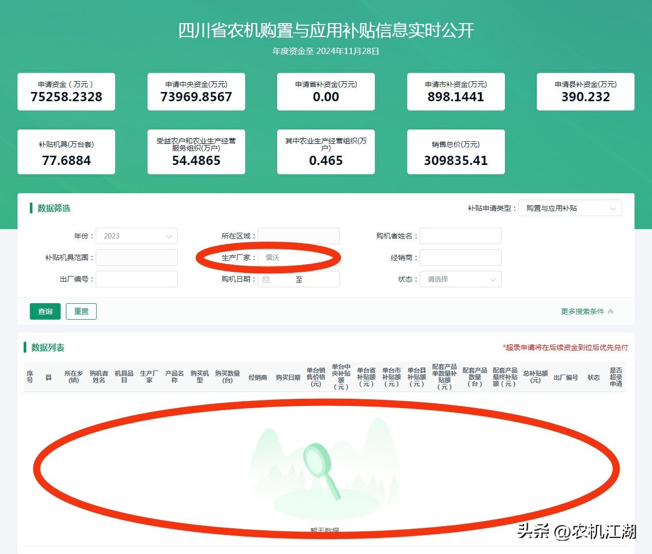四川、江苏、内蒙古采用的“独特版”农机补贴信息实时公开专栏,“数据筛选”中“生产厂家”,厂家名的“字号”前,如有地名等文字,就必须填写,否则查不到任何记录。以“一线”收割机品牌沃得为例:在生产厂家的输入框里,直接写“沃得”,查询结果“开天窗”空白;必须把沃得前面的“江苏”两字加上,即“江苏沃得”,才可查到N多条数据。