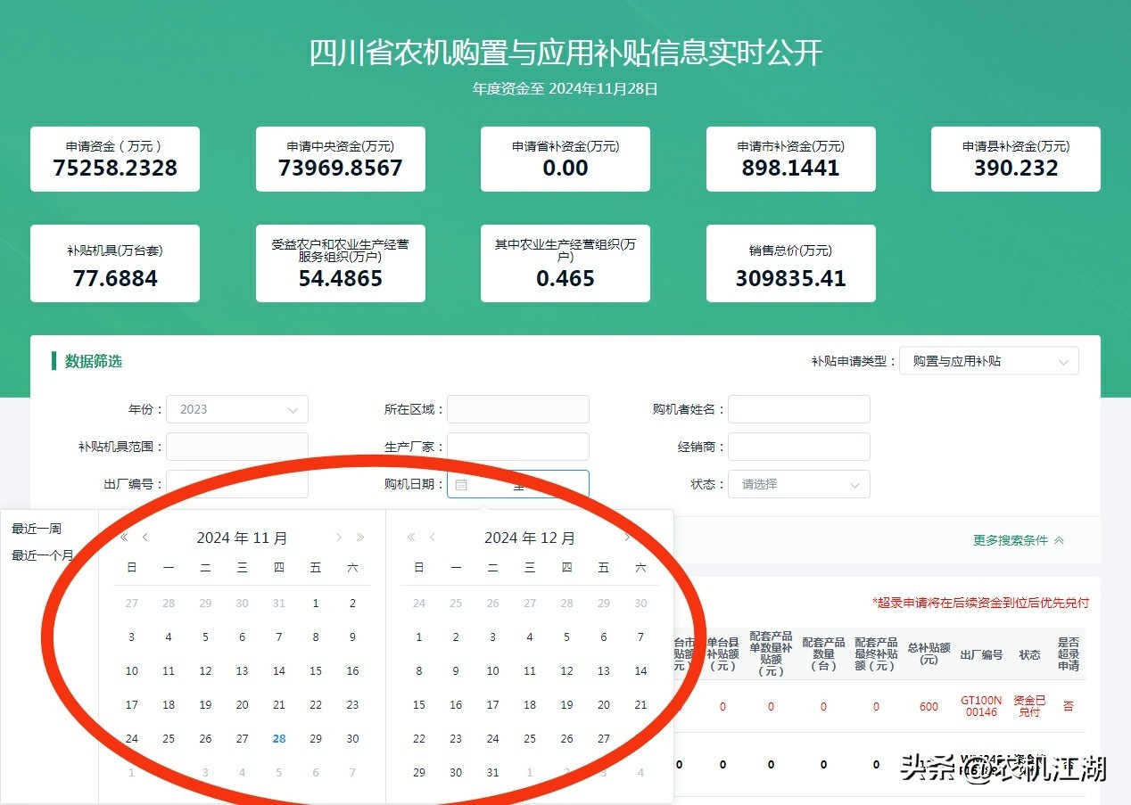三省区采用的“独特版”农机补贴信息实时公开专栏,还有个更明显、需要改善之处:“购机日期”不能点选“同一月份”的时间范围。每当一个自然月份结束后,很多业内人士,要统计上月份(第一天到最后一天),农机补贴相关数据。除了基层“官人”做月度补贴进度报告,各有关机构组织、厂商个人,也要做相关统计,用来指导生产、销售或分享等。