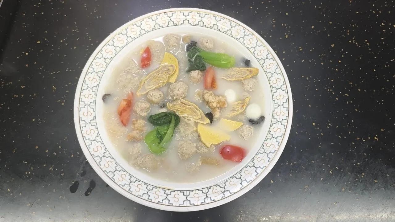 老杂拌,一道地方特色美食,也是当地大席菜中必不可少的一道当家菜。其食材丰富,通常包括皮肚、鹌鹑蛋、木耳、番茄、肉丸子、鸡蛋糕等,口感鲜香无比。胡椒粉的味道让人记忆犹新,这些都是成就其地道口感的关键。丸子的食材选料很讲究,选用精品瘦猪肉制馅,保持顺时针搅拌40 分钟,加佐料用80度热水手工打成丸子,并重新开锅烹制。