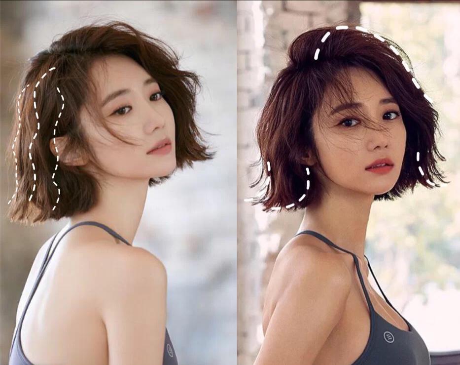 长度在下巴左右,脸蛋两侧往外翻,发尾内扣,缩短脸部长度,更显甜美可爱。刘海为三七分,轻松优化头身比,更显身材高挑。