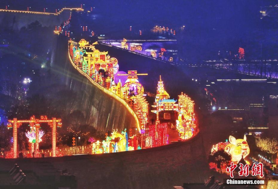 1月28日晚,第33届中国秦淮灯会正式亮灯,南京明城墙上下、秦淮河畔,各形各色的彩灯洋溢着出浓郁的年味。图为城墙上的灯饰多彩绚丽。中新社记者 泱波 摄