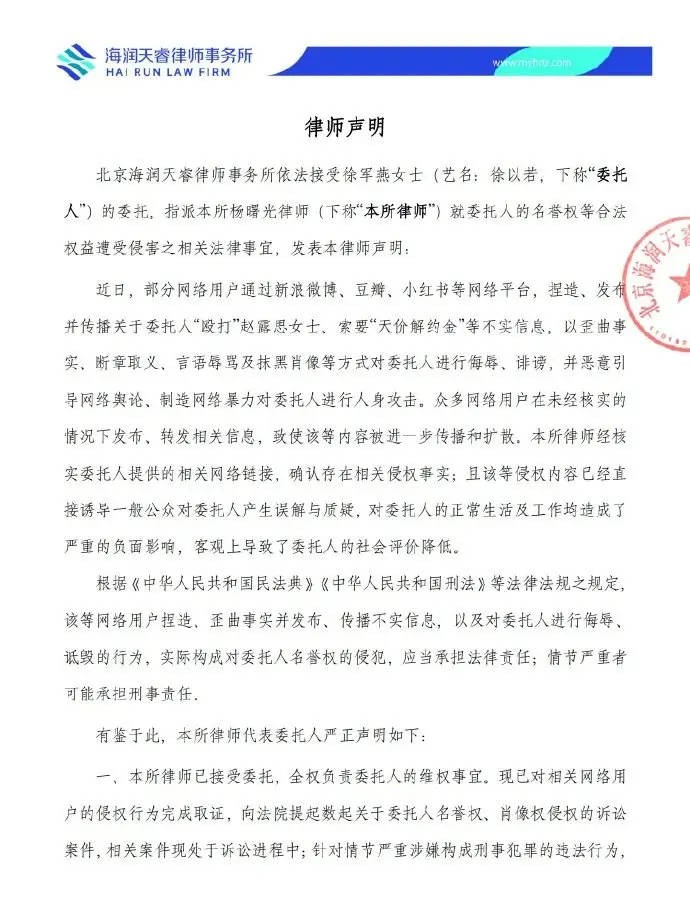 徐以若委托律师发布声明:否认网传“殴打”赵露思等不实信息