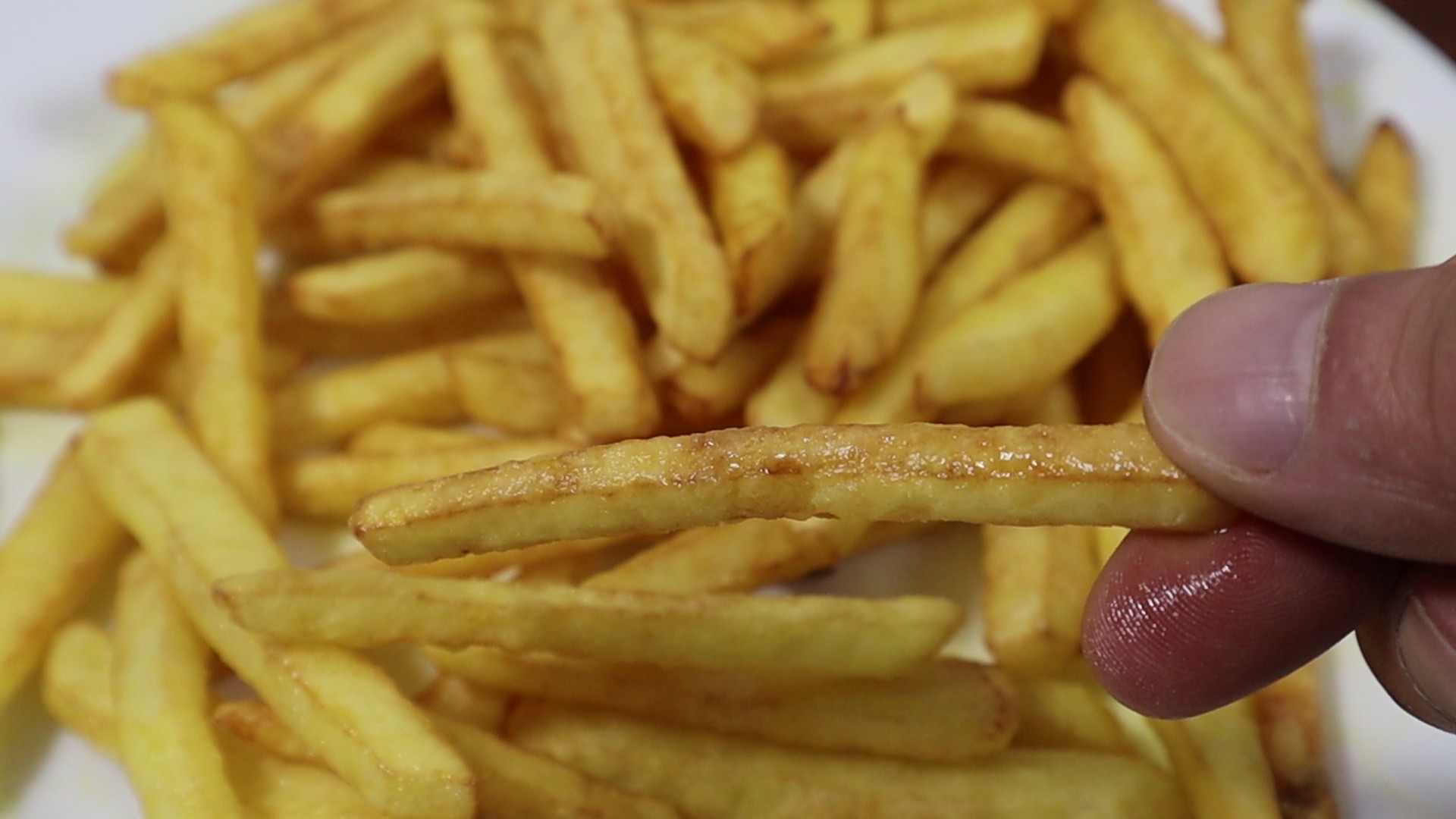 第二步:锅中倒油,油温6成热的时候,将处理好的土豆条全部下进锅中。把土豆条炸至微微发黄,先捞出备用。二次升高油温,油温升至7成热,将炸好的土豆条全部倒进锅中,炸至四面金黄,然后捞出控油备用。
