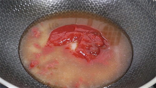 第四步:锅中不加水不加油,加入1勺淀粉、2勺醋、3勺白糖、4勺番茄酱、5勺清水。
