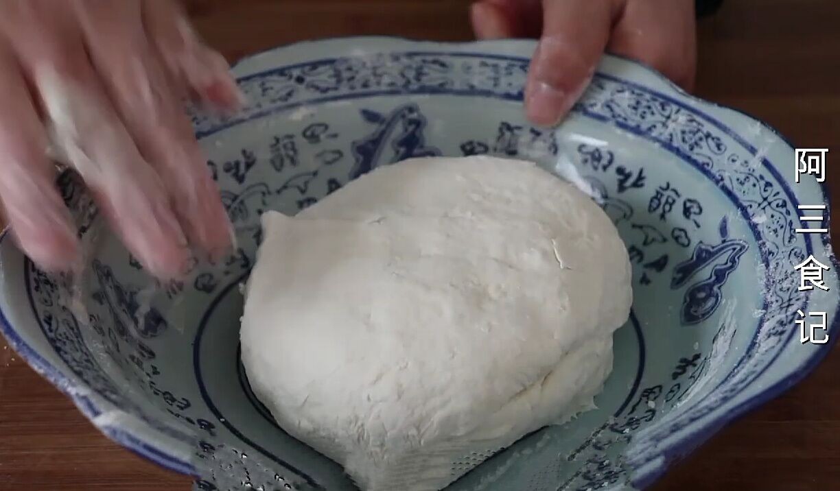 [基本步骤]1.首先,500克面粉里面加入4克小苏打和泡打粉。先用筷子搅拌一下,然后再倒入盐水和面,搅成絮状之后,下手揉成面团。揉好以后放到一边,松弛10分钟。