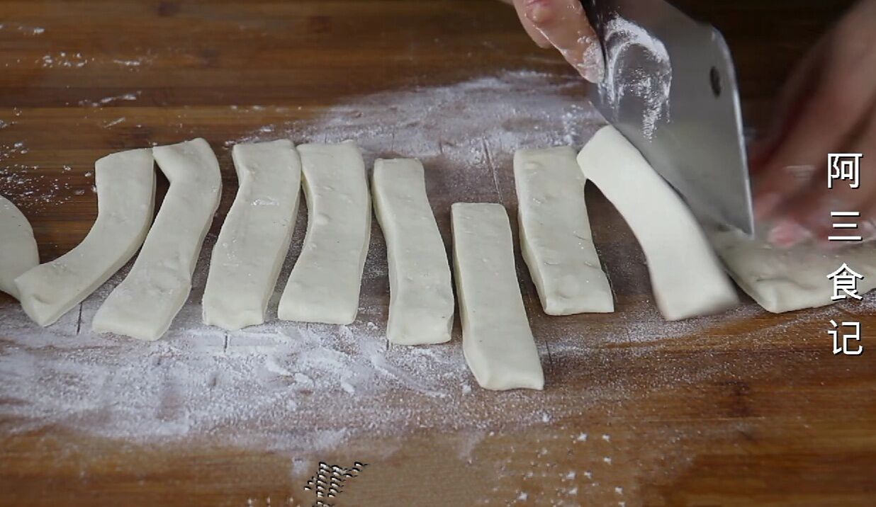 4.擀薄以后,再将它切成等份的两厘米宽的小长条。可以在桌面上撒上一些面粉,不至于让小长条全部粘连到一起。