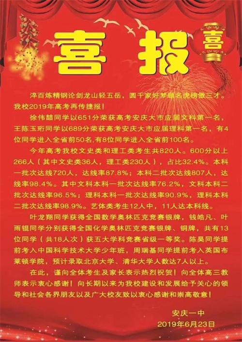 2019高考安庆最高分出炉:文科656分、理科702分!还有新鲜出炉的各高中喜报
