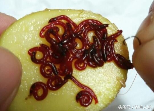 最后,直接用鱼钩扎土豆片上的红虫即可完成挂钩动作。