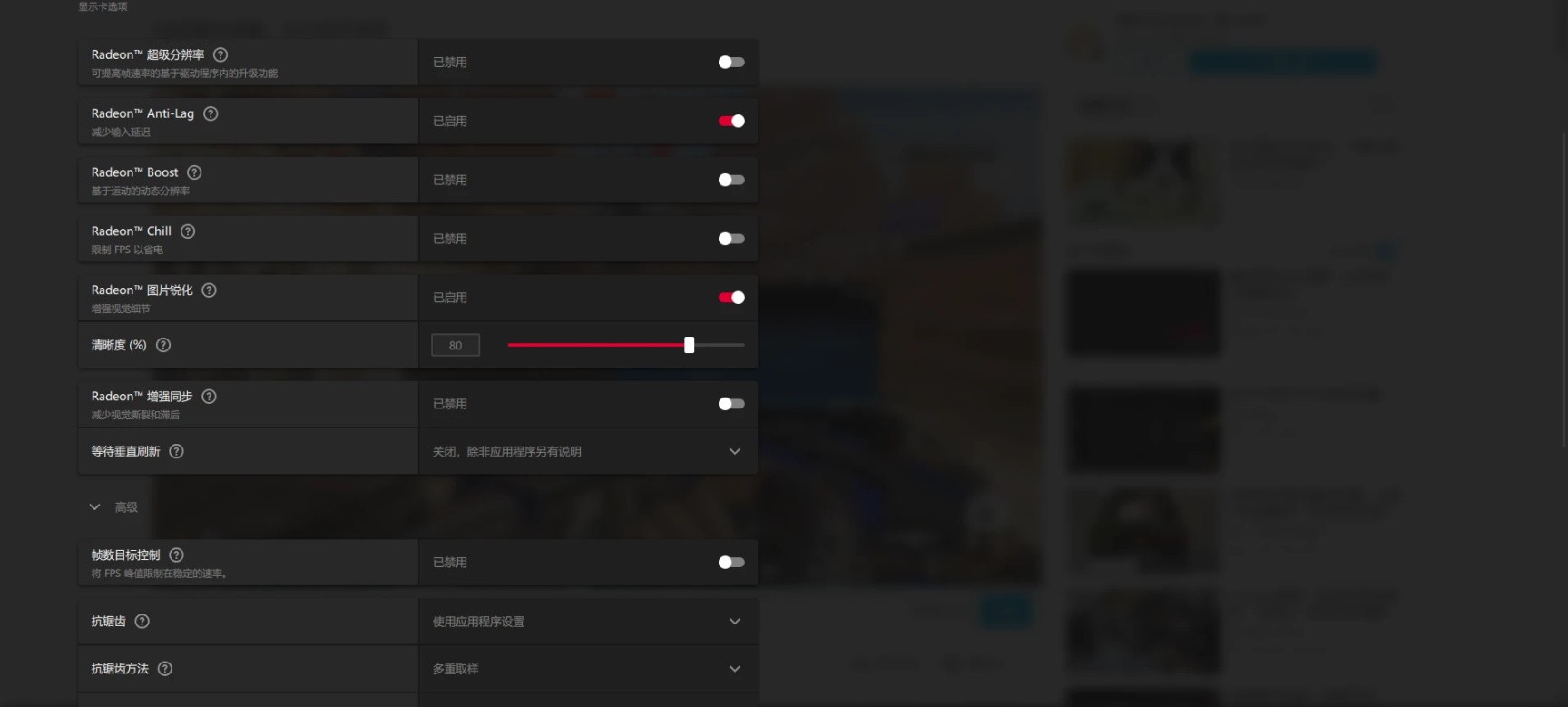 Anti-lag【开启】:减少输入延迟(A卡黑科技,感知性不强,开着有心理安慰)。