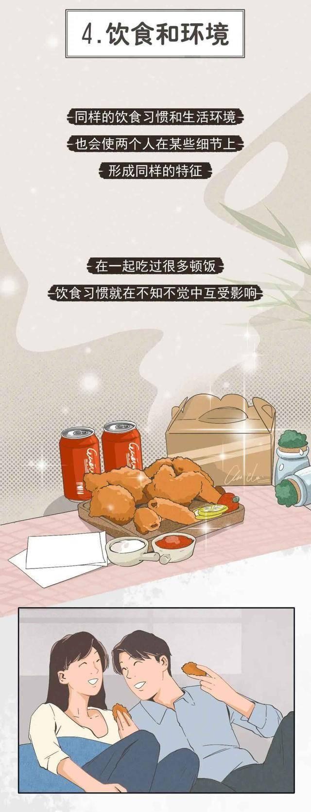 两个人在一起生活久了,生活步调,生活习惯以及心态等等的一切逐渐保持平衡甚至交汇到一条直线上,在外人看来,两个人的身上和精神形态都有很多相似点,看起来很有夫妻相。