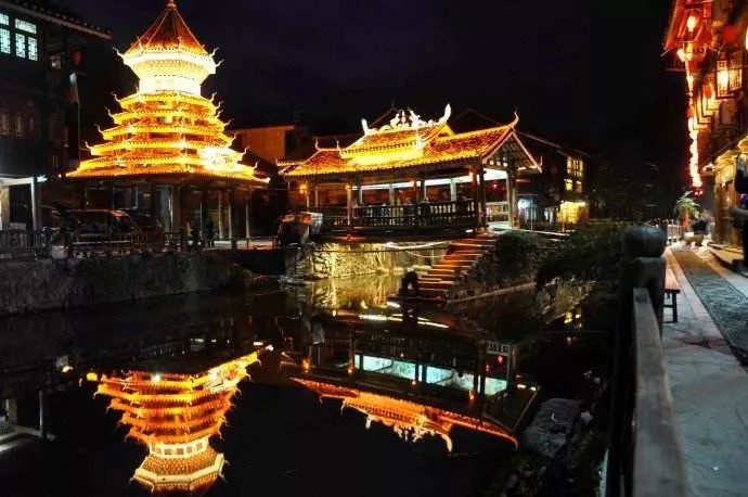 楼之最,蔚为壮观。肇兴侗寨在穿寨而过的小河上,还建有五座小型拙朴的花桥,以配鼓楼。其仁团、义团的花桥与鼓楼、戏楼,匠心独特。