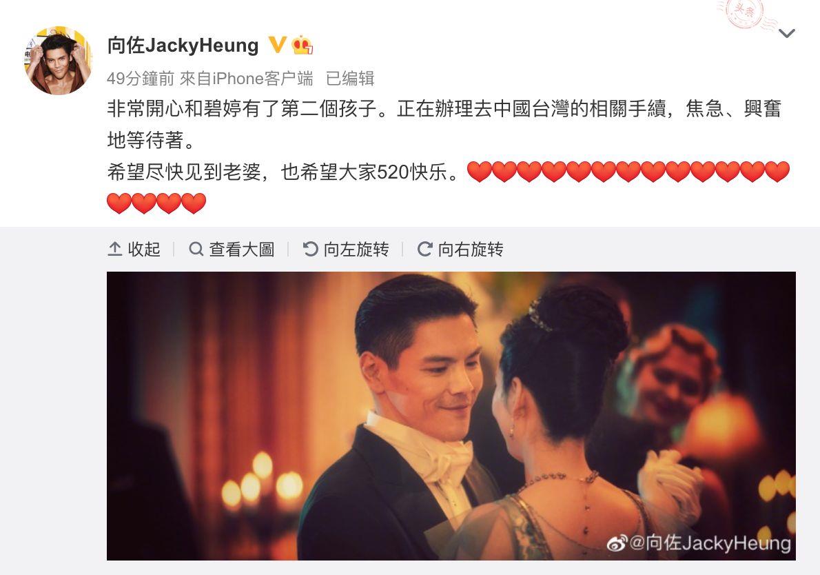 向佐官宣郭碧婷怀二胎。(图/翻摄自微博/向佐)