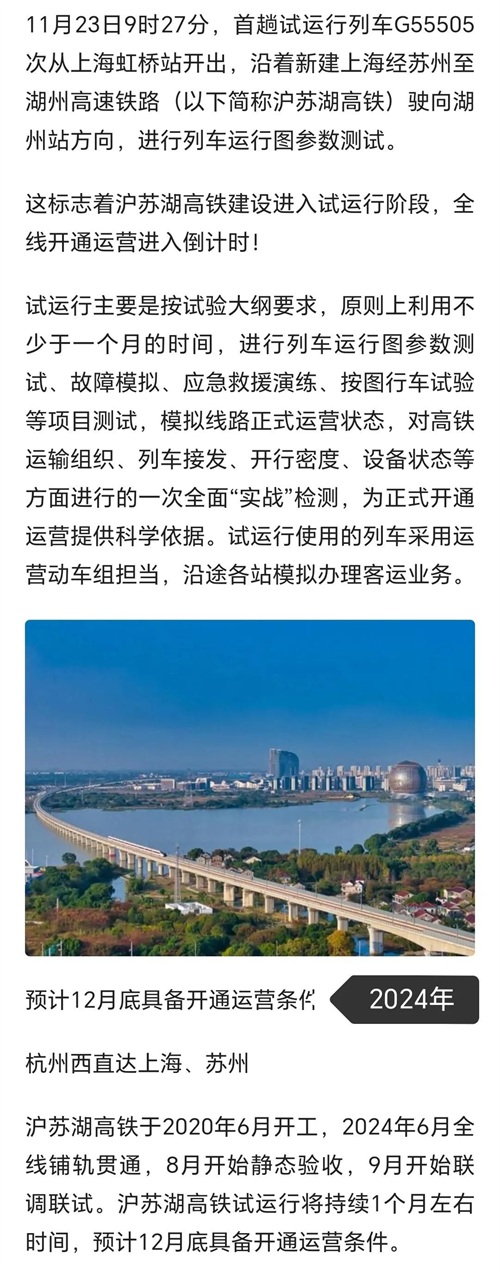 江浙沪第一天路:沪苏湖高铁开始试运行